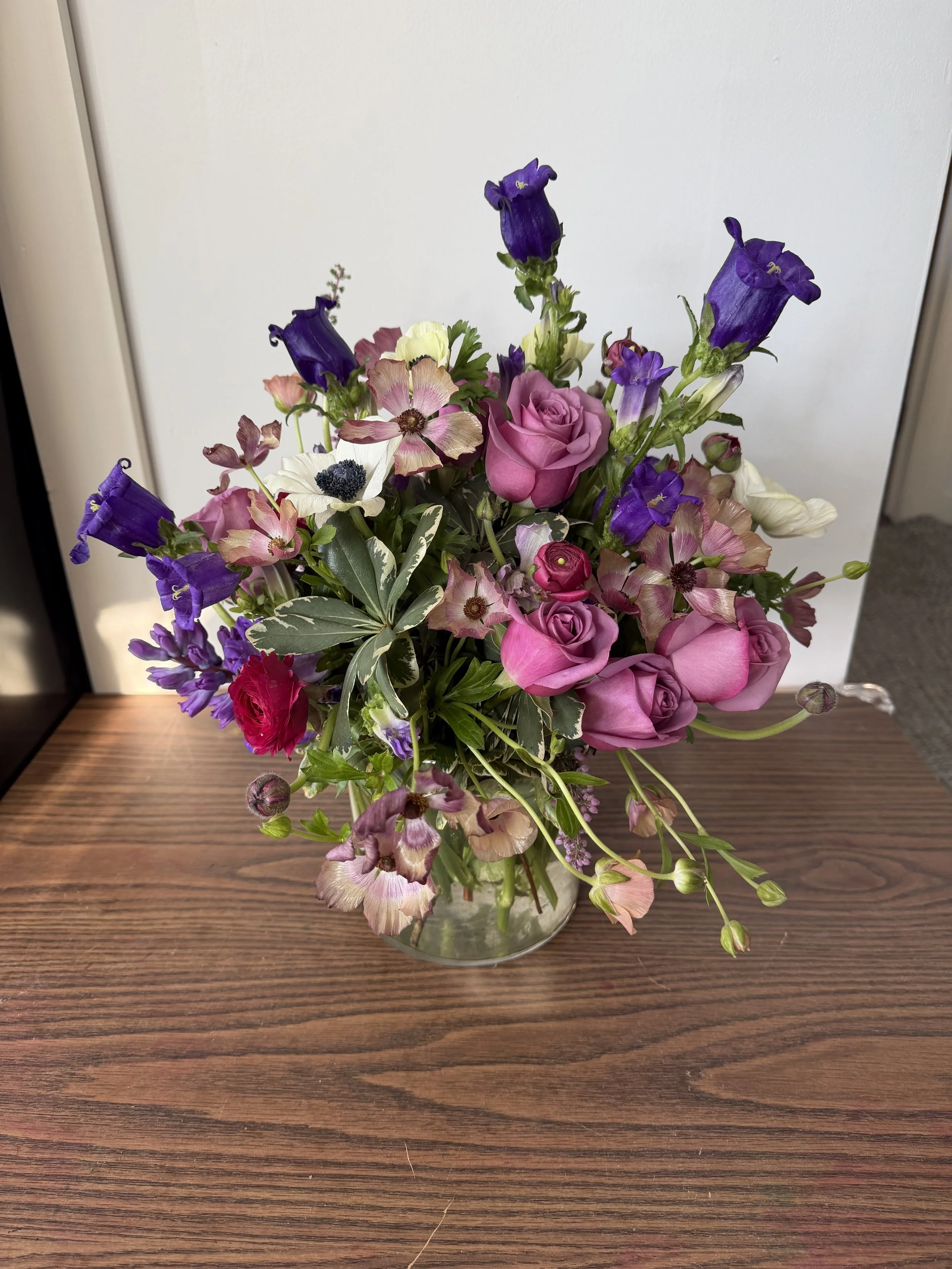 Please list any special requests, such as types of flowers to include, specific colors etc. in the order form. Otherwise our designers will put together the freshest mix of Valentine’s inspired flowers in a glass vessel. If you would like roses please specify color and quantity please specify if you prefer in a vase or wrapped in cellophane.